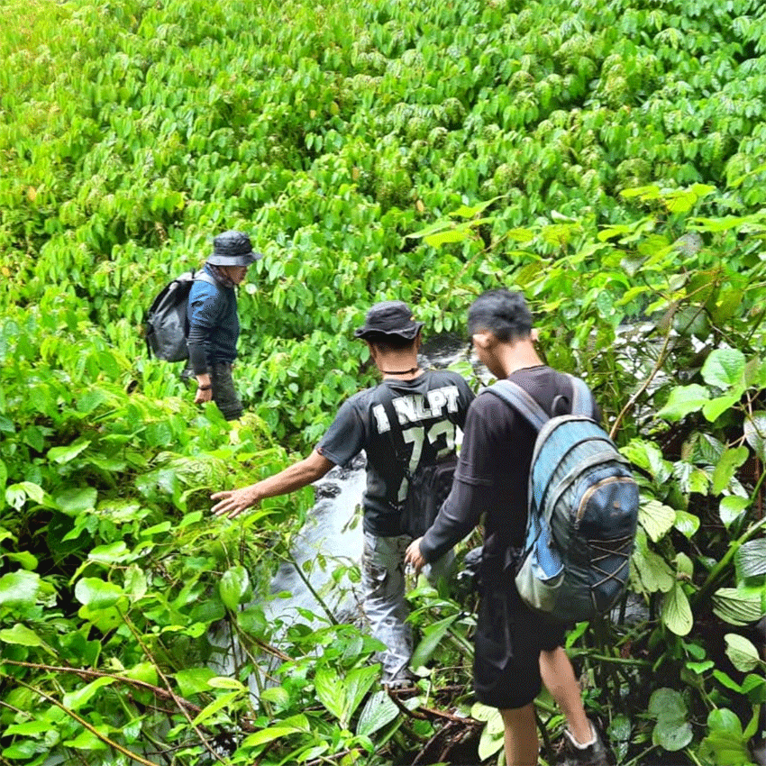 Beberapa menit setelah menapaki jalur, barulah terasa bahwa jalan menuju Air Terjun Sungai Dalam tidak semudah yang dibayangkan. Jalurnya menurun tajam, licin, dan di beberapa titik cukup berbahaya karena berada di tepi jurang. Setiap langkah harus diperhitungkan dengan hati-hati. Kadang harus berpegangan pada akar pohon, berjalan perlahan, bahkan memanjat di beberapa bagian yang curam.