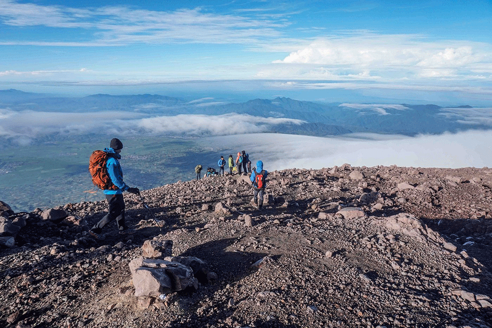 • Jaket tebal dan sarung tangan: angin di puncak bisa menusuk tulang